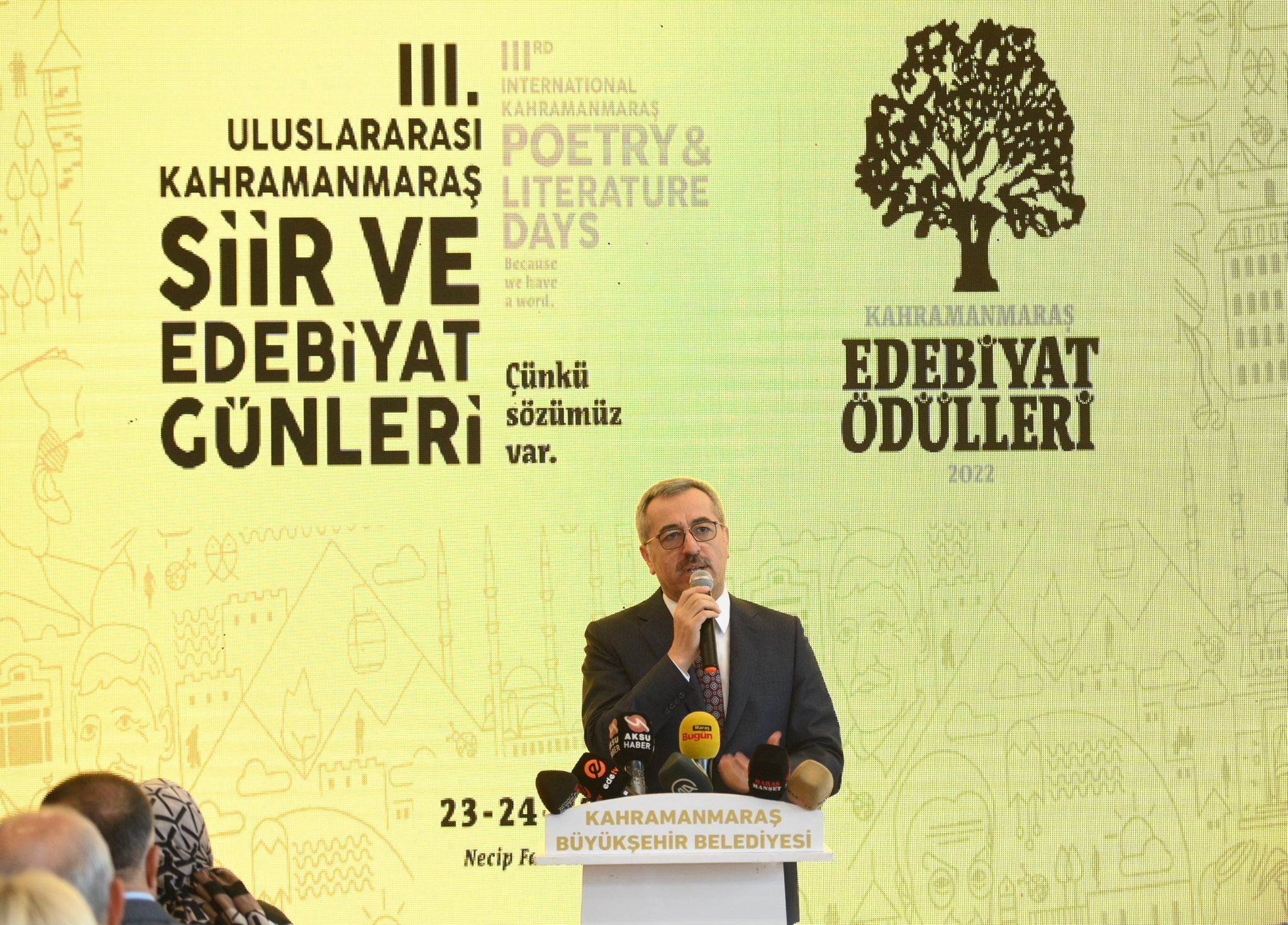 Büyükşehir Belediye Başkanı Hayrettin Güngör, burada yaptığı konuşmada, “Anadolu’muzun her şehrinin ayrı bir hikâyesi, kadim bir tarihi ve öne çıkan değerleri var. Kahramanmaraş’ımızın da öne çıkan değerlerinden bir tanesi şiir ve edebiyatın başkenti olması. Çünkü bizim söyleyecek sözümüz var. Bu kadim topraklar çok büyük şair, ozan ve yazarlar yetiştirmiştir. Gaziantep’in gastronomi alanında UNESCO Yaratıcı Şehirler Ağına dâhil olmasının ardından Sayın Cumhurbaşkanımız, Kahramanmaraş’ımızın da uluslararası arenada şiir ve edebiyat kimliğiyle yer alması gerektiğini ifade etmişti. Şiir ve edebiyat alanında var olan değerimizi hak ettiği yere taşımak için gayret ediyoruz. Bunun için Uluslararası Şiir ve Edebiyat Günleri etkinliğimizin bu yıl 3’üncüsü gerçekleştiriyoruz” ifadelerini kullandı.