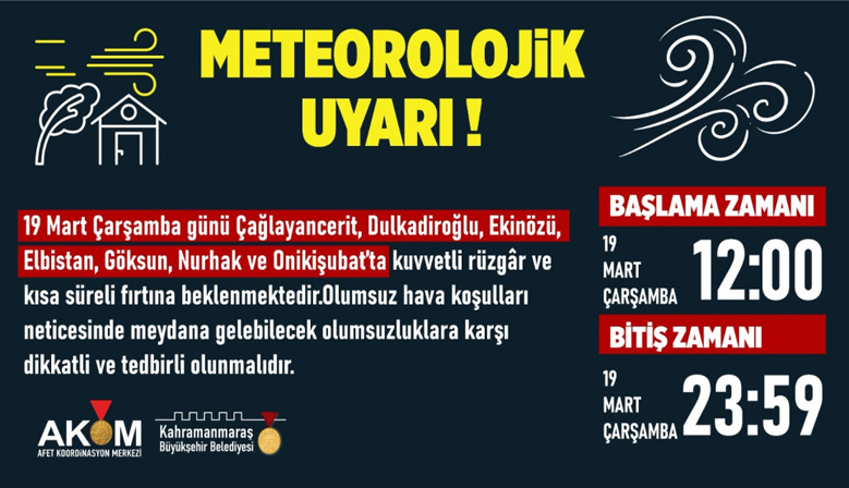 Kahramanmaraş Büyükşehir Belediyesi Afet Koordinasyon Merkezi tarafından yapılan açıklamaya göre, 19 Mart Çarşamba günü şehir genelinde kuvvetli rüzgâr ve zaman zaman fırtına etkili olacak. Özellikle Çağlayancerit, Dulkadiroğlu, Ekinözü, Elbistan, Göksun, Nurhak ve Onikişubat’ta öğle saatlerinden itibaren başlaması beklenen olumsuz hava koşullarının gece saatlerine kadar devam edeceği tahmin ediliyor. Büyükşehir Belediyesinden yapılan açıklamada, herhangi bir olumsuzluk yaşanmaması için gerekli tüm önlemlerin alındığı vurgulanarak, vatandaşların da tedbirli olması gerektiği belirtildi. Açıklamada, “Şehrimizde beklenen kuvvetli rüzgâr ve fırtına nedeniyle çatı uçması, ağaç ve direk devrilmesi, ulaşımda aksamalar gibi olumsuzluklar yaşanabilir. Vatandaşlarımızın bu süreçte dikkatli ve tedbirli olmaları önem arz etmektedir” ifadelerine yer verildi. Ayrıca, belediye ekiplerinin teyakkuz halinde olduğu ve olası ihbarlar karşısında hızlı bir şekilde müdahale edecekleri bildirildi. Vatandaşlar, acil durumlar için 112 Acil Çağrı Merkezi ve ALO 153 Çağrı Merkezi’ni arayarak destek alabilecek.