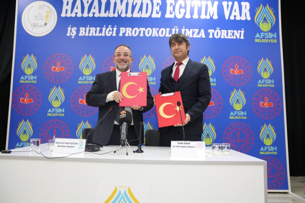 Afşin Belediyesi Sebahattin Atalay Kültür Merkezinde düzenlenen törende, eğitim ve öğretimin kalitesini artırmak, öğrencilerin sosyal, kültürel ve akademik yönde desteklemek, eğitim hizmet kalitesini geliştirmek ve yaygınlaştırmak amacıyla gerçekleştirilen işbirliği protokolüne, Afşin Belediye Başkanı Mehmet Fatih Güven ile Afşin İlçe Milli Eğitim Müdürü Fatih Kaba imza attı.