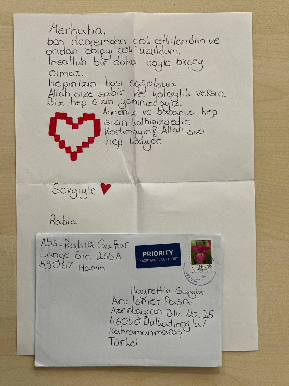 6 Şubat depremlerinin ardından şehrin tekrar ayağa kaldırılması noktasında tüm alanlarda çalışmalar sürerken bir yandan da şehre yardımlar gelmeye devam ediyor. Şehrin imarı ve inşası noktasında kamu kurumları, çeşitli sivil toplum kuruluşları ve gönüllülerin yardım seferberliği sürerken Almanya’nın Hamm kentinden mektup eşliğinde bir zarfla gönderilen bağış ise duygulandırdı. Rabia Gafar, Kahramanmaraş Büyükşehir Belediye Başkanı Hayrettin Güngör’e ithafen kaleme aldığı mektupta, “Merhaba, ben depremden çok etkilendim ve ondan dolayı çok üzüldüm. İnşallah bir daha böyle bir şey olmaz. Hepinizin başı sağ olsun. Allah size sabır ve kolaylık versin. Biz hep sizin yanınızdayız. Anneniz ve babanız hep sizin kalbinizdedir. Korkmayın! Allah sizi hep koruyor. Sevgiyle” ifadelerine yer verdi.