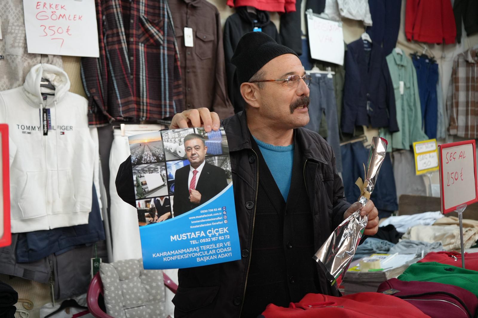 Kahramanmaraş Terziler ve Konfeksiyoncular Odası Başkan Adayı Mustafa Çiçek, seçim çalışmaları kapsamında Sosyete Pazarı esnafını ziyaret etti. Çarşı esnafıyla tek tek görüşen Çiçek, esnafın talep, sorun ve beklentilerini yerinde dinledi.