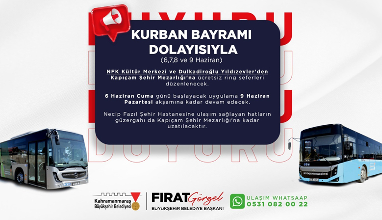 Büyükşehir Belediyesi, ahirete irtihal eden yakınlarını Kurban Bayramı’nda kabirleri başında ziyaret etmek isteyen vatandaşlar için NFK Kültür Merkezi ve Dulkadiroğlu Yıldızevler’den Kapıçam Şehir Mezarlığı’na ücretsiz ring seferleri düzenleyecek.