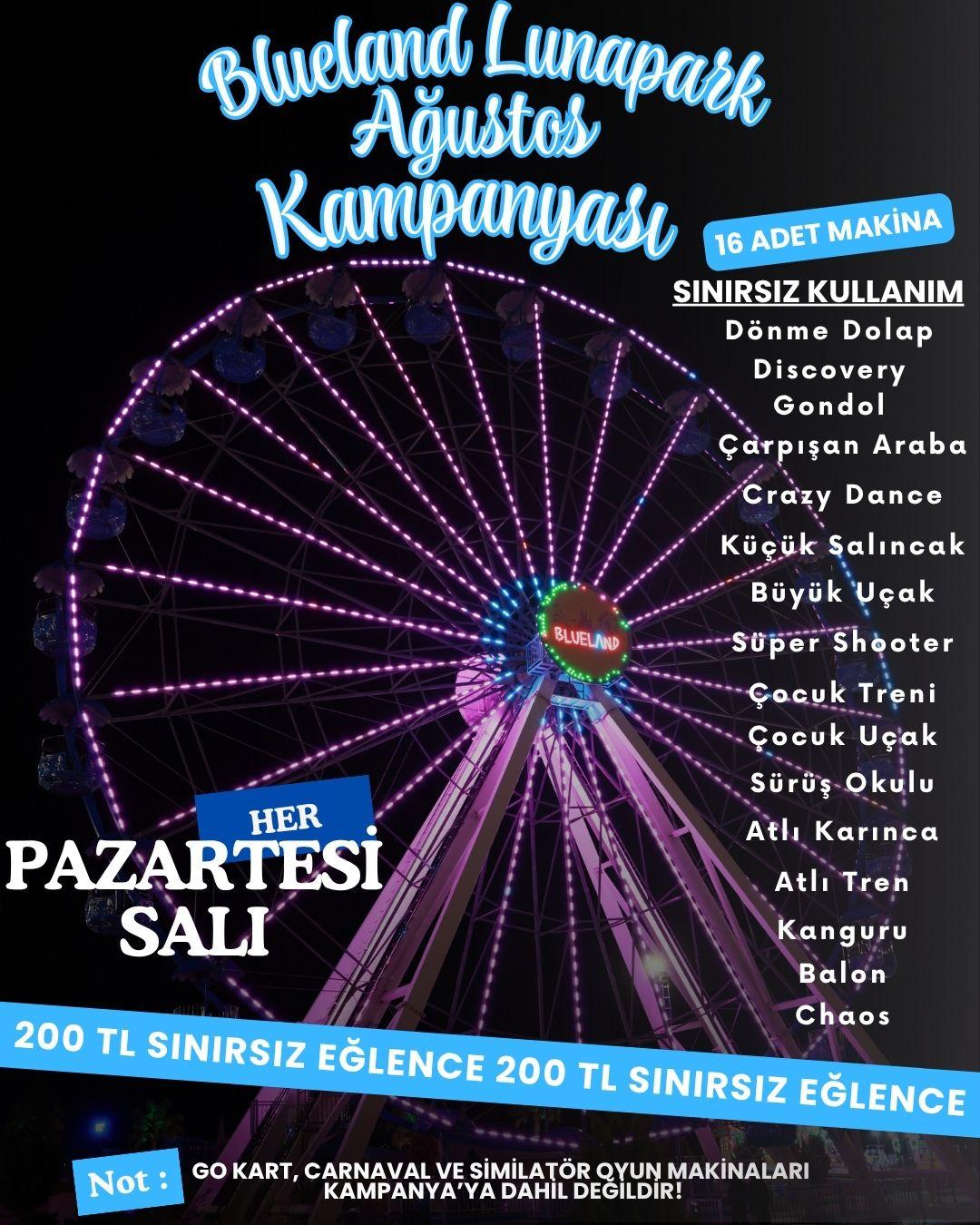 Bölgenin en büyük eğlence merkezi BlueLand, heyecan verici bir kampanya ile ziyaretçilerini sınırsız eğlenceye davet ediyor. Pazartesi ve Salı günleri BlueLand Kart’a 200 TL yükleme yapan herkes, Go-Kart, Karnaval ve Simülatör oyun makineleri hariç tüm makine ve oyuncakları sınırsız kullanabilecek.