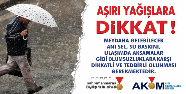 Kahramanmaraş Büyükşehir Belediyesi Afet Koordinasyon Merkezi (AKOM) tarafından yapılan açıklamada sağanak yağışlara karşı vatandaşların dikkatli olması istendi. Konu ile ilgili olarak AKOM’dan yapıla...