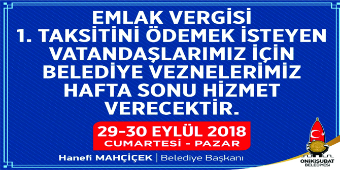 Onikişubat Belediyesi’nden yapılan açıklamada yapılandırma kapsamındaki vergi borçlarının 1. taksitini ödemek isteyen vatandaşlara hafta sonu da hizmet verileceği belirtildi. 29- 30 Eylül 2018 Cumarte...