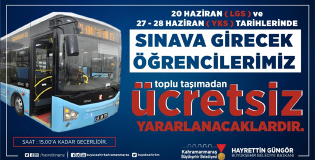 Büyükşehir Belediyesi LGS Sınavına girecek tüm öğrencilere toplu taşıma araçlarının ücretsiz olacağını duyurdu. Kahramanmaraş Büyükşehir Belediyesi Ulaşım Hizmetleri Dairesi Başkanlığı’ndan yapılan aç...