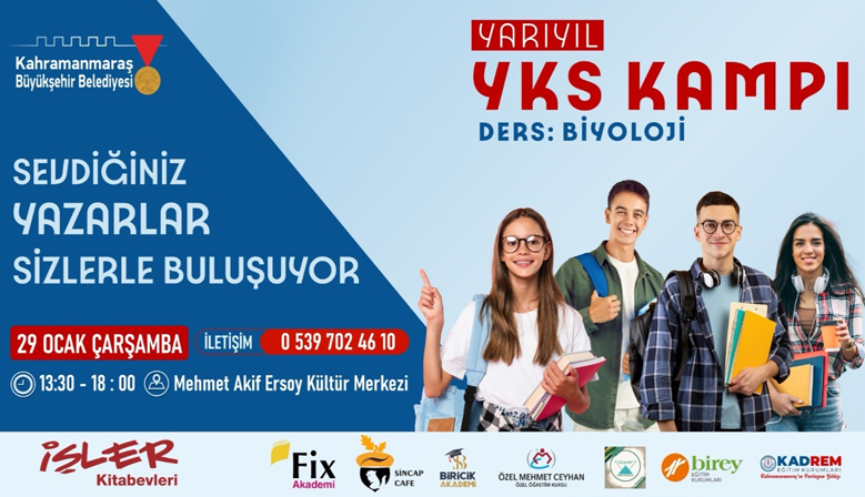 Büyükşehir Belediyesinin ücretsiz YKS kampı, 29 Ocak Çarşamba günü Biyoloji dersiyle devam edecek. 13.30 – 18.00 saatleri arasında Mehmet Akif Ersoy Kültür Merkezi’nde gerçekleştirilecek programda; As...