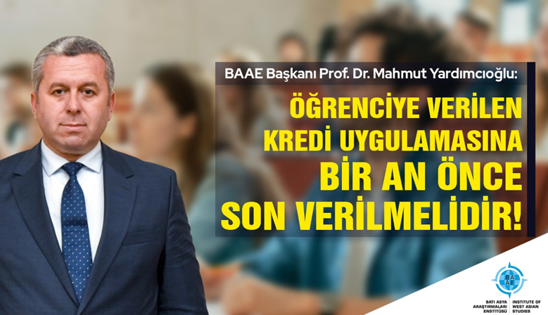 Batı Asya Araştırmaları Enstitüsü (BAAE) Başkanı Prof. Dr. Mahmut Yardımcıoğlu, öğrencilere verilen kredi uygulamasının, okul sonrası olumsuz etkilediğini belirterek örgün öğrenci olarak ön lisans, li...