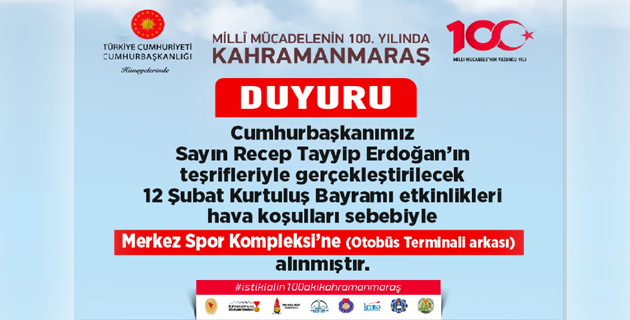 Kahramanmaraş’ın düşman işgalinden kurtuluşunun 100. Yılı kutlama etkinliklerinde final programının yeri değişti. Cumhurbaşkanı Recep Tayyip Erdoğan’ın da katılacağı kutlamalar 12 Şubat günü Merkez Sp...