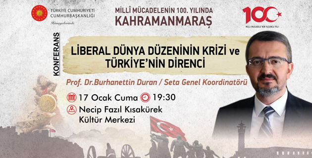 Kahramanmaraş’ın düşman işgalinden kurtuluşunun 100. Yılı kutlama etkinlikleri kapsamında Seta Genel Koordinatörü Prof. Dr. Burhanettin Duran’ın konuşmacı olarak katılacağı Liberal Dünya Düzeninin Kri...