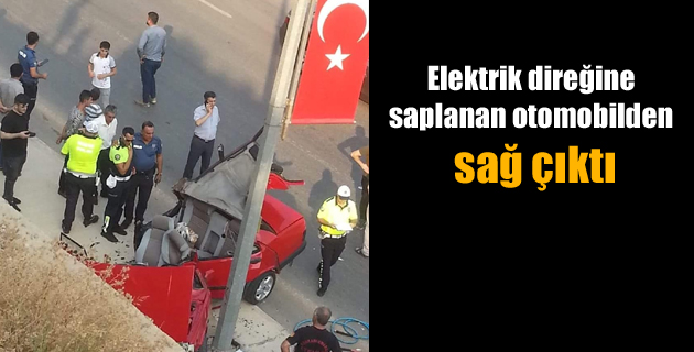 Elektrik direğine saplanan otomobilden sağ çıktı