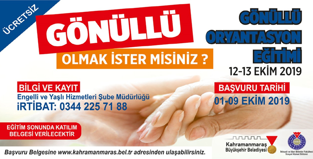 Büyükşehir Belediyesi Gönüllü Oryantasyon Eğitimleri başvuruları başladı. 12 ve 13 Ekim’de gerçekleştirilecek eğitimler için 9 Ekim Çarşamba gününe kadar internet üzerinden kayıt yapılabilecek. Kahram...