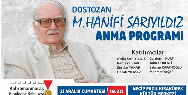 Büyükşehir Belediyesi, Kahramanmaraş’ın yetiştirdiği değerli Halk Ozanı M. Hanifi Sarıyıldız’ı vefatının yıldönümünde unutmadı. Kahramanmaraş Büyükşehir Belediyesi, Dostozan M. Hanifi Sarıyıldız için ...