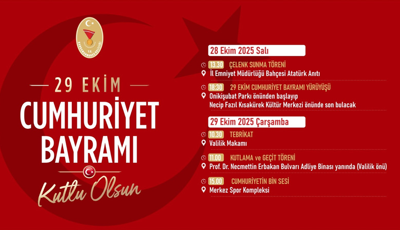 Cumhuriyet’in ilanının 102. yıl dönümü dolayısıyla Büyükşehir Belediyesi ve Valilik iş birliğiyle 28 ve 29 Ekim tarihlerinde çeşitli kutlama etkinlikleri düzenlenecek. Kutlama programlarına tüm vatand...
