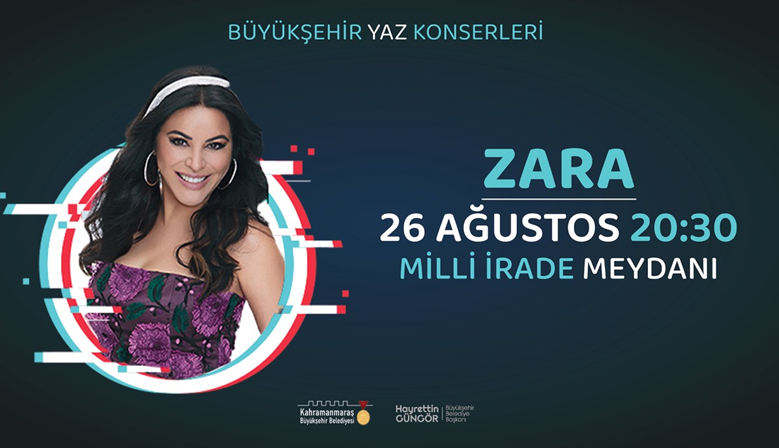 Büyükşehir Belediyesi Yaz Konserleri kapsamında 26 Ağustos Cuma günü saat 20.30’da Türk Halk Müziği Sanatçısı Zara, Milli İrade Meydanı’nda Kahramanmaraşlılarla bir araya gelecek. Kahramanmaraş Büyükş...