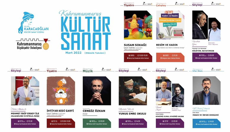 Kahramanmaraş Büyükşehir Belediyesi Mart Kültür Sanat Etkinlikleri takvimi belli oldu. Birbirinden değerli isimlerin katılımıyla konserden tiyatro gösterilerine, söyleşiden konferansa kadar pek çok et...