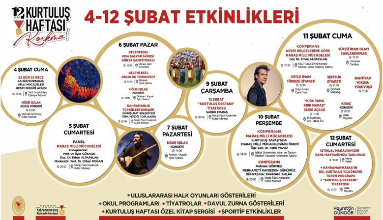 İlk etkinlik 4 Şubat Cuma: “Uğur Işılak konseri” Kurtuluş Haftası Etkinlikleri Başlıyor Kahramanmaraş’ın düşman işgalinden kurtuluşunun 102. yıldönümü kapsamında bir hafta boyunca sürecek etkinlikler ...