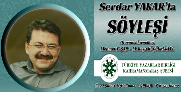 Türkiye Yazarlar Birliği Kahramanmaraş Şubesi, “Serdar Yakar’la Söyleşi” programı düzenliyor. Kahramanmaraş’ın tarihi ve edebî birikimi ile ilgili çalışmalarıyla bilinen Araştırmacı-Yazar Serdar Yakar...