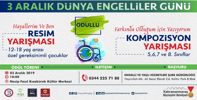 Büyükşehir Belediyesi 3 Aralık Dünya Engelliler Günü’nde farkındalık oluşturmak için resim ve kompozisyon yarışması düzenliyor. Kahramanmaraş Büyükşehir Belediyesi 3 Aralık Dünya Engelliler Günü kapsa...
