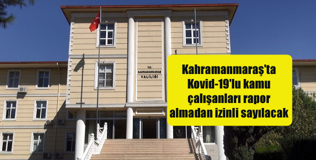 Kahramanmaraş’ta, yeni tip koronavirüs (Kovid-19) tedbirleri kapsamında Kovid-19’lu kamu çalışanları rapor almadan izinli sayılacak. Valiliğin sosyal medya hesabından yapılan açıklamada, V...