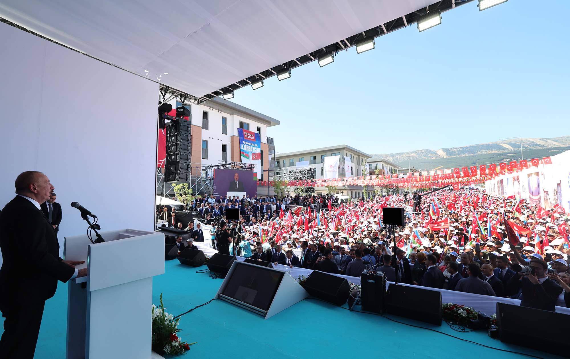 Azerbaycan Cumhurbaşkanı İlham Aliyev konuşmasında, 6 Şubat depremlerini Azerbaycan halkının kendi acısı gibi yaşadığını ifade etti. Depremin ilk gününden itibaren Türkiye’nin yardımına koştuklarını belirten Aliyev, “Bugün burada, Azerbaycan Mahallesi’nin açılışında bulunmaktan büyük mutluluk duyuyorum. Kahramanmaraşlı kardeşlerimiz için burada kalıcı bir yaşam alanı kurduk. Türkiye ile kardeşliğimiz ebedidir” dedi.