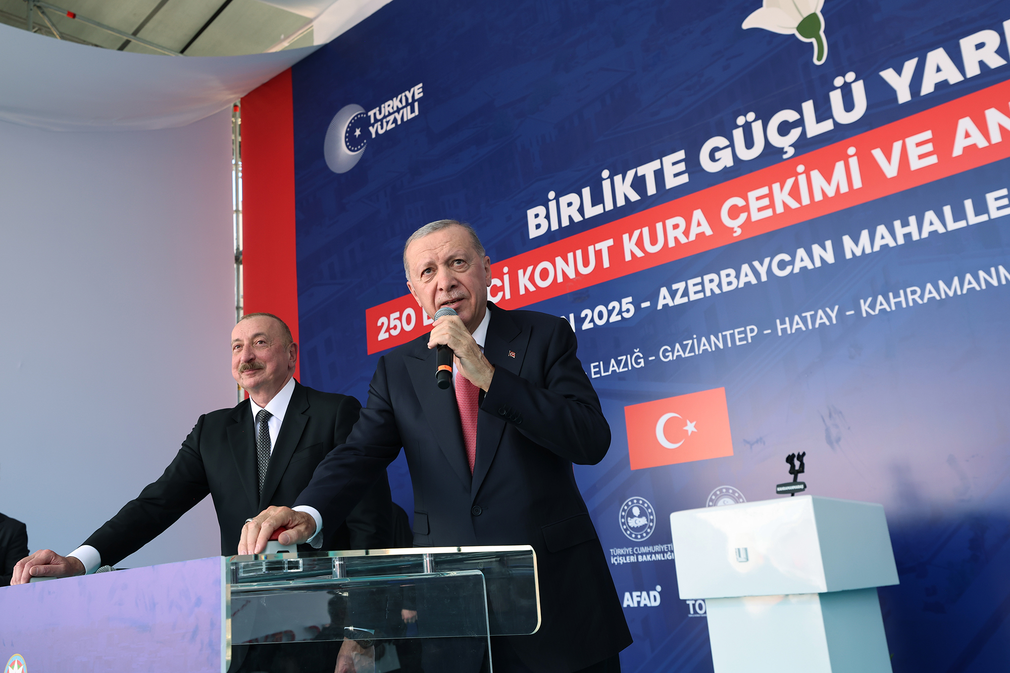 Cumhurbaşkanı Recep Tayyip Erdoğan konuşmasında, Azerbaycan ile Türkiye arasındaki bağların bir kez daha ete kemiğe büründüğünü belirtti. Deprem sonrası Azerbaycan’ın gösterdiği samimi dayanışmayı hiçbir zaman unutmayacaklarını vurgulayan Erdoğan, “Azerbaycan Mahallesi bizim gurur projelerimizden biri. Haydar Aliyev İlkokulu’ndan parklarına, ofislerine kadar burası modern yaşamın tüm gereklerini karşılayan bir alan olarak inşa ediliyor. 2 bin 778 konut, dükkân ve ofisin inşası tüm hızıyla sürüyor. Bugün Kahramanmaraş’ımızda 3 bin 567 konut ve 744 iş yeri olmak üzere deprem bölgesinde 49 bin 56 bağımsız bölümü daha hak sahiplerine teslim ediyoruz. 2025 yılı sonunda hedefimiz 453 bin bağımsız bölümü tamamlamak. Deprem bölgesinde şimdiye kadar 2 Trilyon TL’yi aşan yatırım yaptık. Asrın felaketi tamamen ortadan kalksın diye 2025 bütçesinde 584 Milyar TL’lik kaynak ayırdık” ifadelerini kullandı. Cumhurbaşkanı Erdoğan ayrıca, depremde 14 sporcusunu kaybeden Kahramanmaraş İstiklalspor’un futbolda 2. Lig’e, basketbolda ise 1. Lig’e yükseldiğini hatırlatarak kulübü tebrik etti.