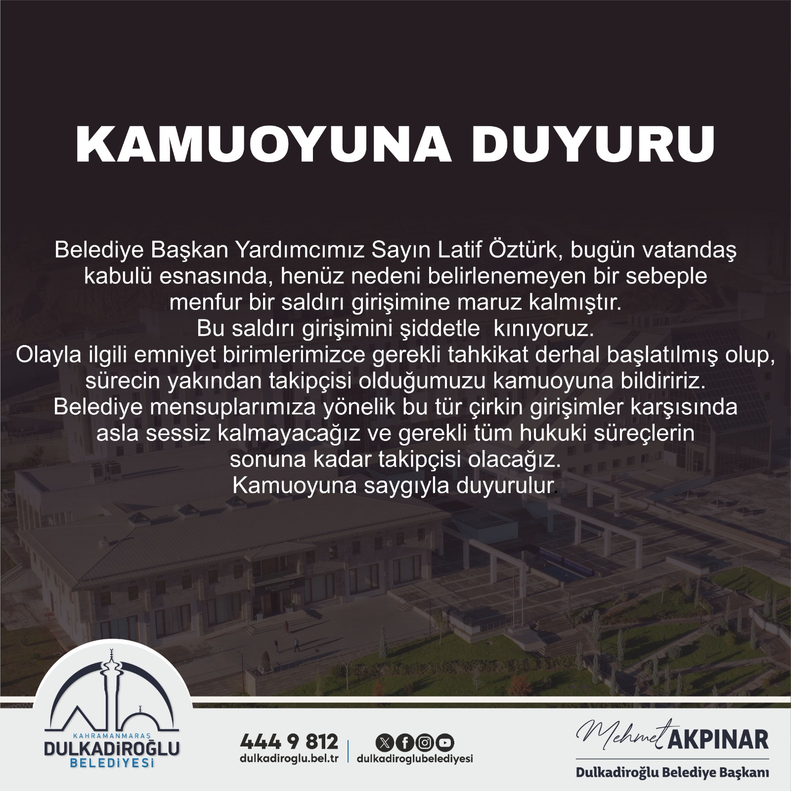 Olayla ilgili emniyet birimlerimizce gerekli tahkikat derhal başlatılmış olup, sürecin yakından takipçisi olduğumuzu kamuoyuna bildiririz. Belediye mensuplarımıza yönelik bu tür çirkin girişimler karşısında asla sessiz kalmayacağız ve gerekli tüm hukuki süreçlerin sonuna kadar takipçisi olacağız.