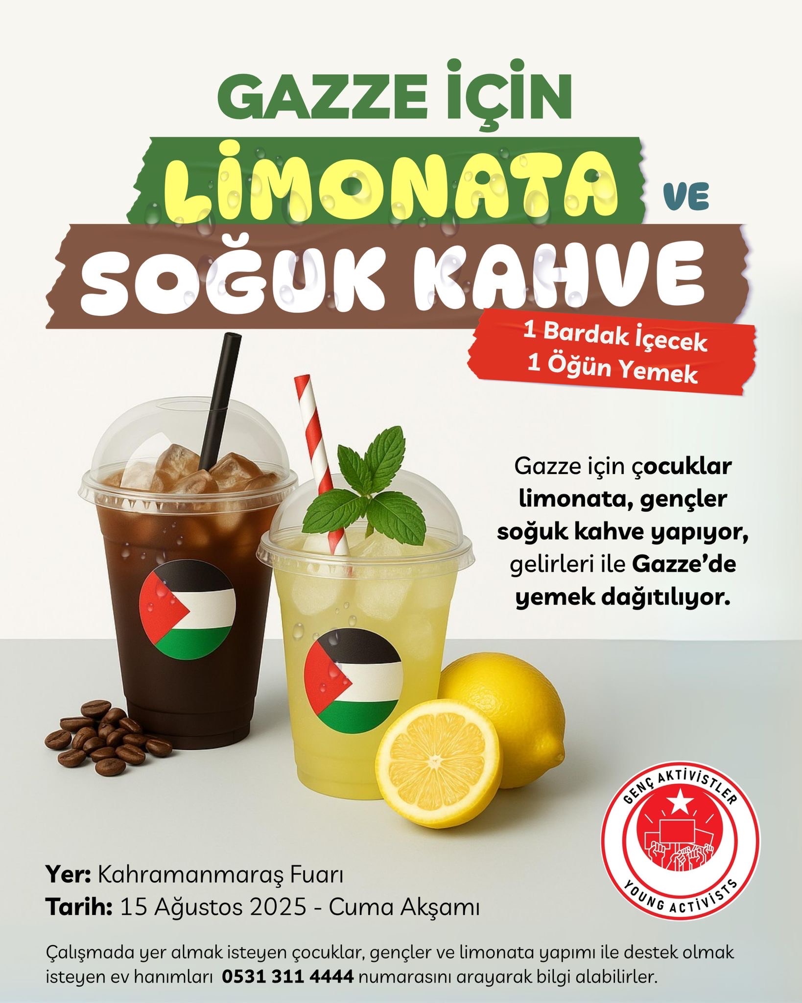Gazze’deki mazlum ve ihtiyaç sahiplerine destek olmak amacıyla İstanbul merkezli Genç Aktivistler, Kahramanmaraş Fuarı’nda anlamlı bir dayanışma etkinliği düzenliyor. 15 Ağustos 2025 Cuma akşamı gerçekleştirilecek etkinlikte çocuklar limonata, gençler ise soğuk kahve yaparak satışa sunacak. Elde edilecek gelir, Gazze’de yemek dağıtımında kullanılacak.