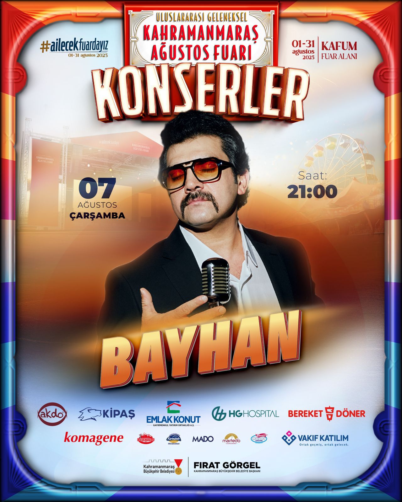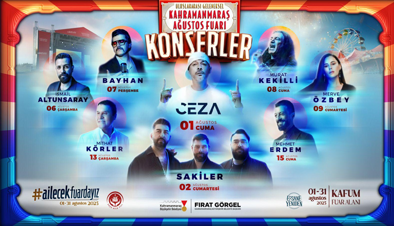 Fuarın en dikkat çeken bölümlerinden biri ise tamamen sponsorların destekleriyle düzenlenecek konserler olacak. Türkiye’nin sevilen sanatçıları Kahramanmaraşlılarla buluşacak. 1 Ağustos’ta Ceza ile başlayacak müzik şöleni, 2 Ağustos Sakiler, 4 Ağustos Burak Bayram, 6 Ağustos İsmail Altunsaray, 7 Ağustos Bayhan, 8 Ağustos Murat Kekilli, 9 Ağustos Merve Özbey, 11 Ağustos Grup Sıra, 13 Ağustos Mithat Körler, 14 Ağustos Süleyman Güçlü ve Furkan Pehlivan, 15 Ağustos Mehmet Erdem, 16 Ağustos İkilem, 18 Ağustos “Oldu O Zaman”, 20 Ağustos Hatice Gökçeli, 21 Ağustos Muhammed Ali Uçar, 22 Ağustos Buray, 23 Ağustos Mustafa Ceceli, 25 Ağustos Mahmut Tuncer, 26 Ağustos Mehmet Hacıbebekoğlu, 27 Ağustos Serkan Kaya, 28 Ağustos Kemal Kutlu, 29 Ağustos Resul Dindar ve 30 Ağustos’ta Gökhan Türkmen konseriyle devam edecek. Fuar boyunca her akşam binlerce kişiyi bir araya getirecek konserlerde sanatçılar, en sevilen şarkılarını Kahramanmaraşlılar için seslendirecek.