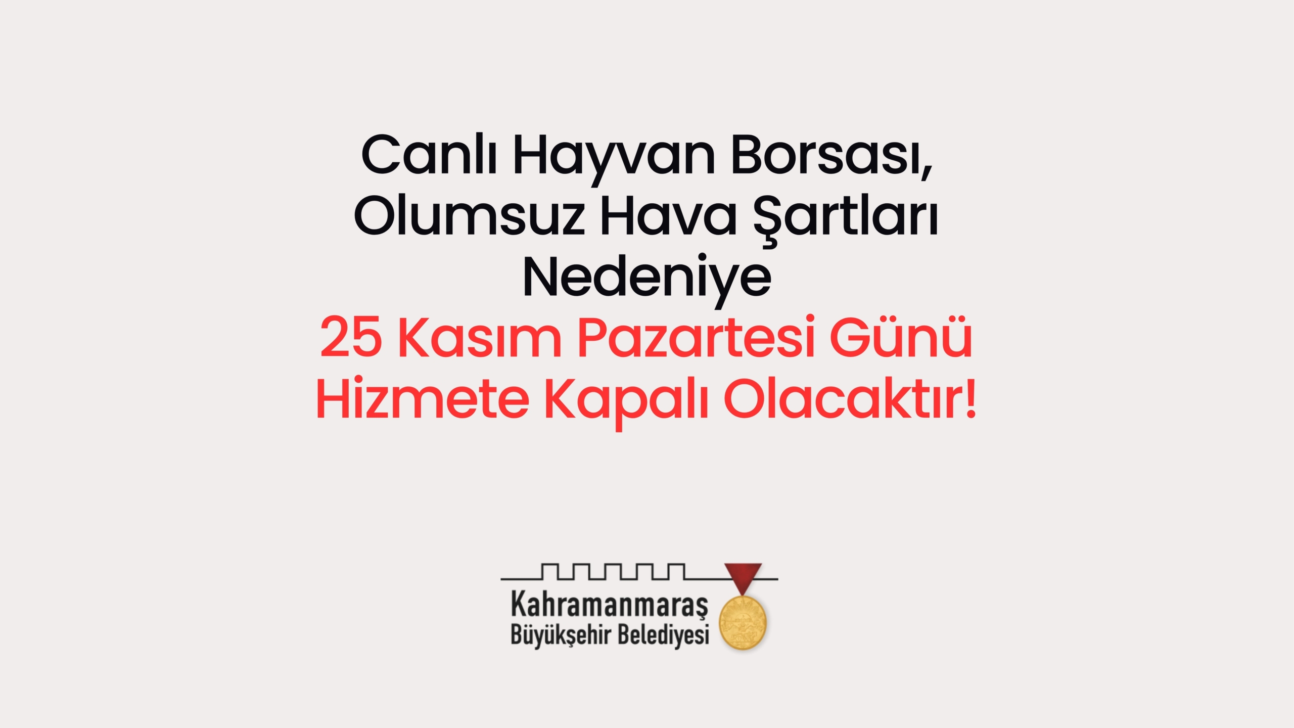 Büyükşehir Belediyesi, olumsuz hava şartları dolayısıyla Canlı Hayvan Borsası’nın 25 Kasım Pazartesi günü hizmete kapalı olacağını duyurdu.