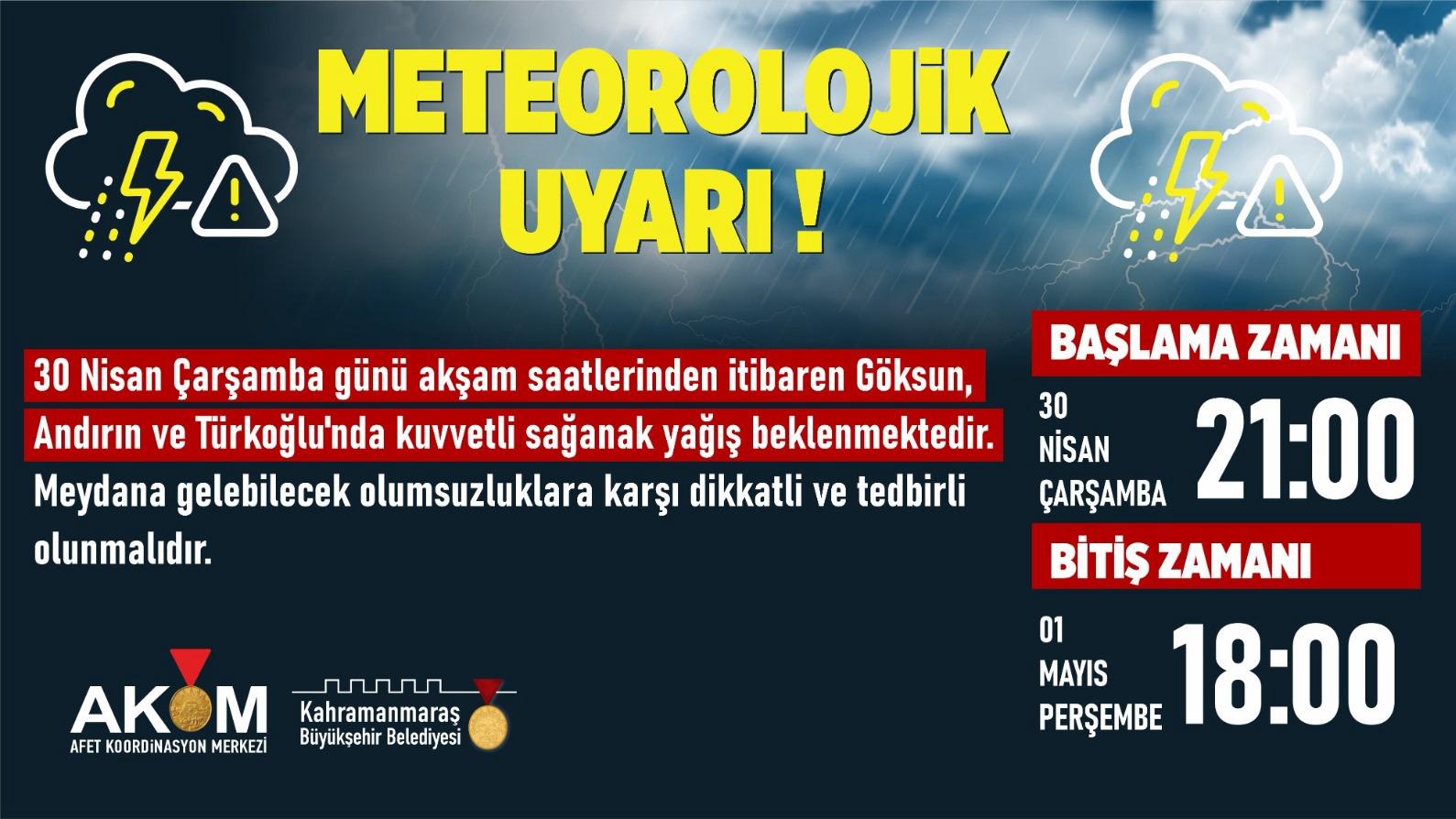 Kahramanmaraş Büyükşehir Belediyesi Afet Koordinasyon Merkezi, 30 Nisan Çarşamba akşamından itibaren Andırın, Göksun ve Türkoğlu ilçelerinde etkili olması beklenen gök gürültülü kuvvetli sağanak yağışlara karşı vatandaşları uyardı. Meteoroloji Genel Müdürlüğü verilerine dayandırılan açıklamada, yağışların 1 Mayıs Perşembe akşam saatlerine kadar süreceği belirtildi. Büyükşehir Belediyesinden yapılan açıklamada, kuvvetli yağışların sel, su baskını ve ulaşımda aksaklıklar gibi olumsuzluklara yol açabileceği kaydedildi. Vatandaşların bu süreçte dikkatli ve tedbirli olmaları gerektiği vurgulandı. Ayrıca Büyükşehir Belediyesinin tüm ekipleriyle sahada olacağı ve yaşanabilecek olumsuzluklara karşı gerekli tüm önlemlerin alındığı belirtildi. Vatandaşların acil durumlarda ALO 153 Çağrı Merkezi üzerinden ilgili ekiplere ulaşabileceği hatırlatıldı.