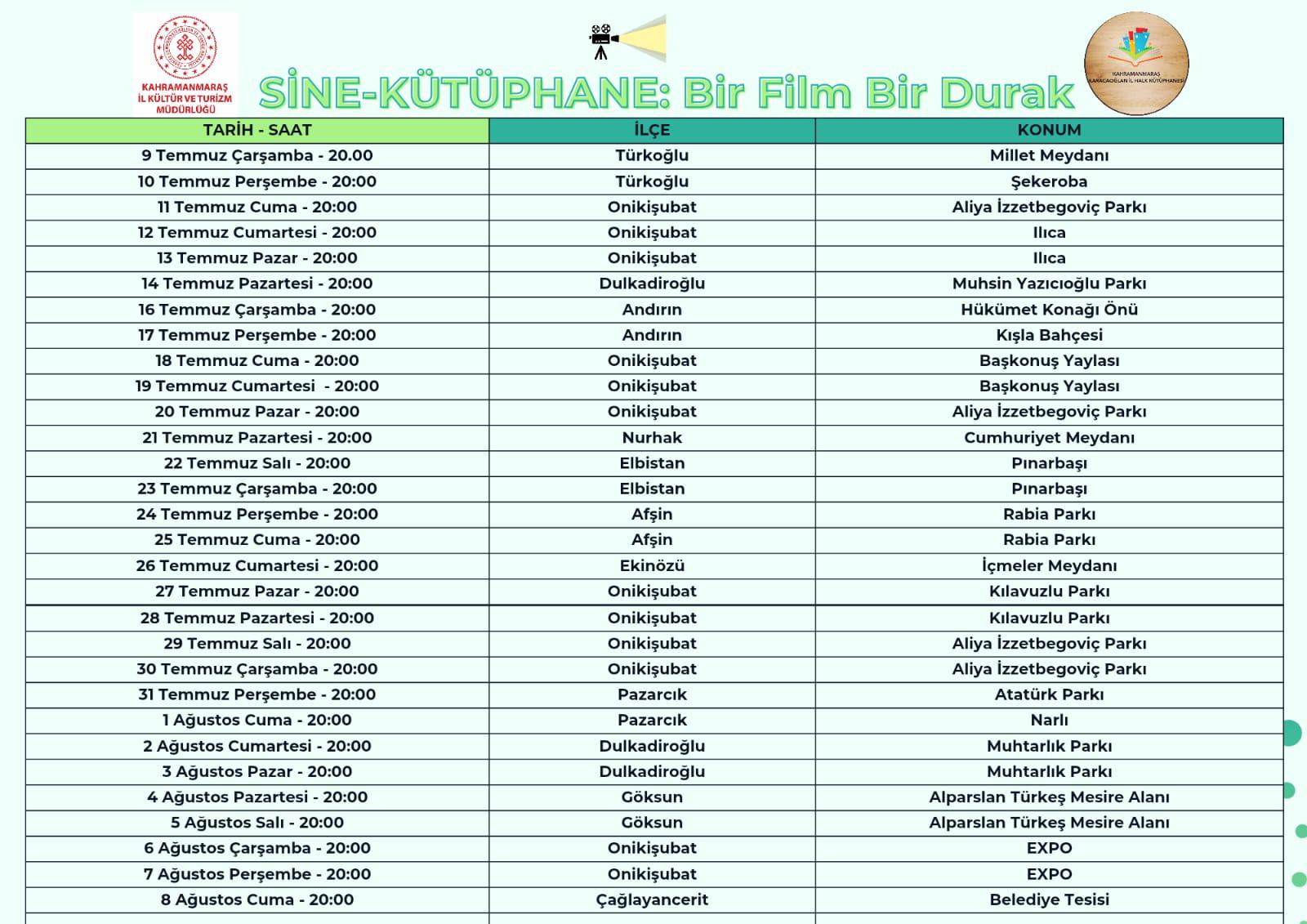 Kahramanmaraş’ta “Sine-Kütüphane: Bir Film, Bir Durak” projesiyle gezici kütüphane aracı eşliğinde 9 Temmuz–8 Ağustos tarihleri arasında ilçelerde açık hava sinema gösterimleri düzenlenecek.