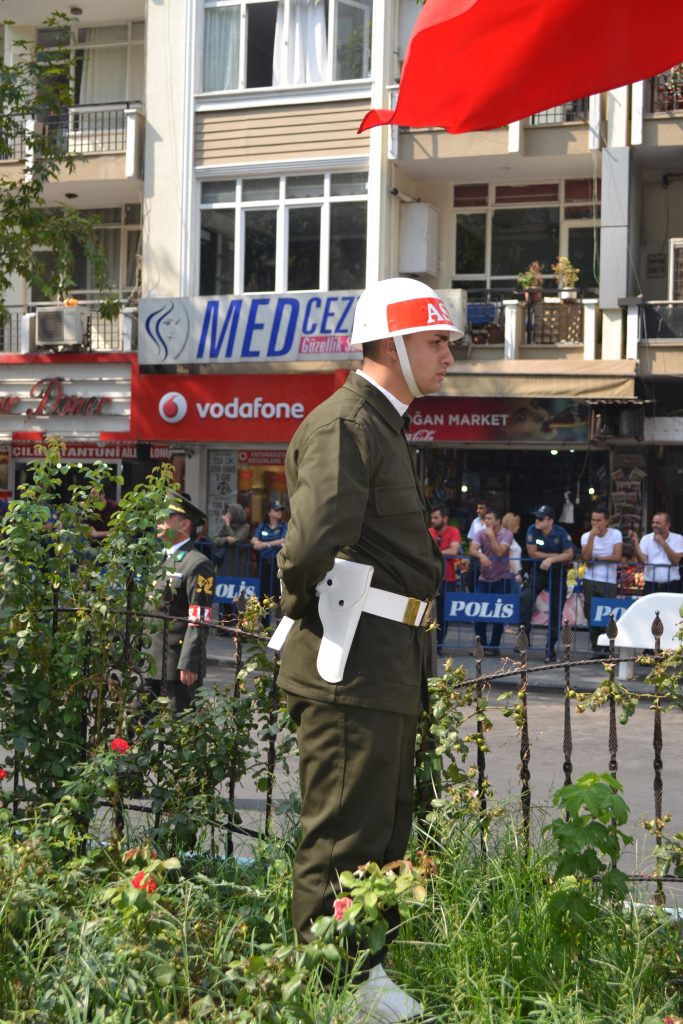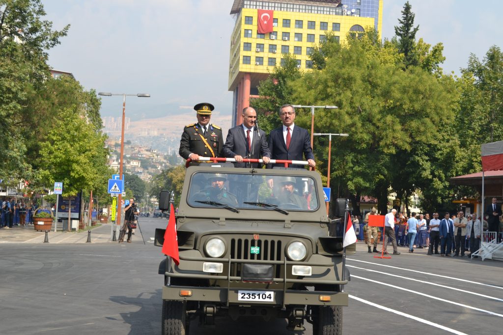 Trabzon Caddesi’nde devam eden törende, Vali Özkan ile Büyükşehir Belediye Başkanı Güngör, askeri araçla caddeden geçerek vatandaşları ve protokolü selamladı.