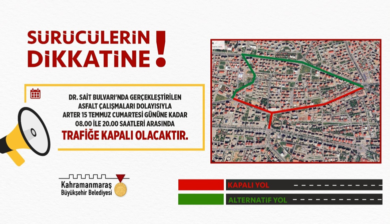 Şehrin ulaşım ağını güçlendirmek için yol yenileme çalışmalarını kesintisiz sürdüren Kahramanmaraş Büyükşehir Belediyesi, Onikişubat ilçesi Dr. Sait Bulvarı’nda gerçekleştirilen asfalt çalışmaları nedeniyle arterin 15 Temmuz Cumartesi gününe kadar 08.00 ile 20.00 saatleri arasında trafiğe kapalı olacağını duyurdu. Ulaşım Dairesi Başkanlığı’ndan karar ilişkin yapılan açıklamada; çalışmalar esnasında aksamalara neden olmaması adına caddeye araç park edilmemesi, trafikte herhangi bir olumsuzlukla karşılaşılmaması için trafik işaret ve işaretçilerine dikkat edilmesi ve ulaşımda alternatif güzergâhların kullanılmasının önem arz ettiği belirtildi.