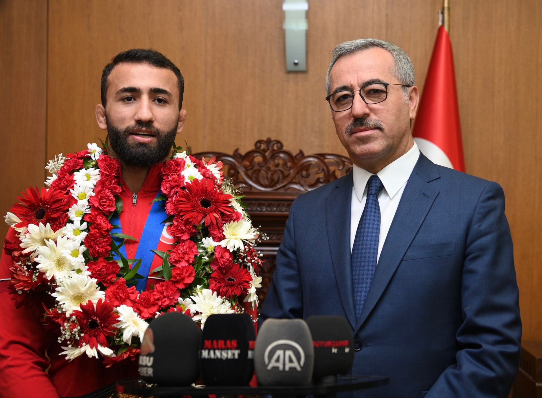 Dünya şampiyonu olan Kahramanmaraşlı milli güreşçi Burhan Akbudak’ı makamında ağırlayan Başkan Güngör, “Bu topraklarda çok büyük güreşçilerimiz yetişti ve büyük başarılara imza attılar. Bu başarı zincirini Burhan kardeşimiz de devam ettiriyor. 23 yıl aranın ardından bizlere bu mutluluğu tekrar yaşattı. Şehrimizi, ülkemizi ve bizleri çok gururlandırdı. Başarılarının devamını diliyorum” dedi.