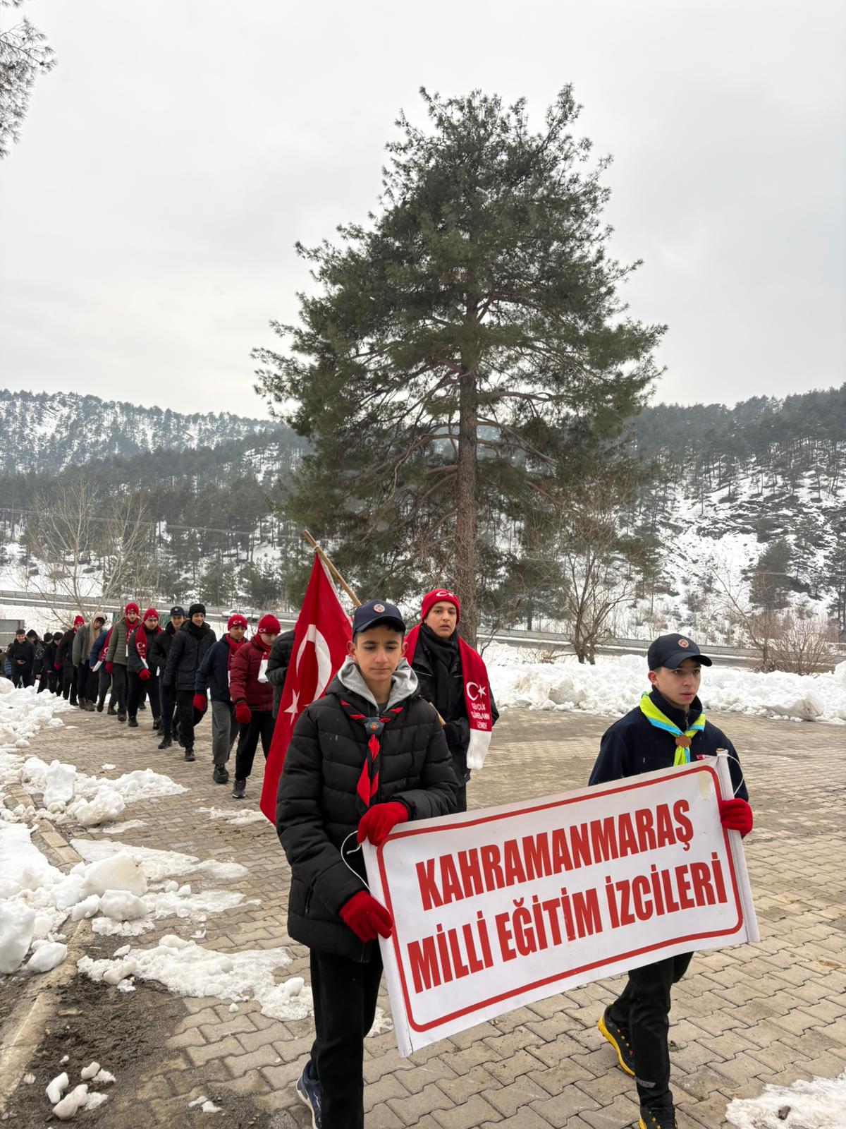 Karlı doğada yapılan yürüyüşte hem zorlu koşullarla mücadele eden izcilerimiz dayanışma ruhunu yaşadı hem de Sarıkamış Harekâtı’nda can veren aziz şehitlerimizi rahmet ve minnetle yad etti.